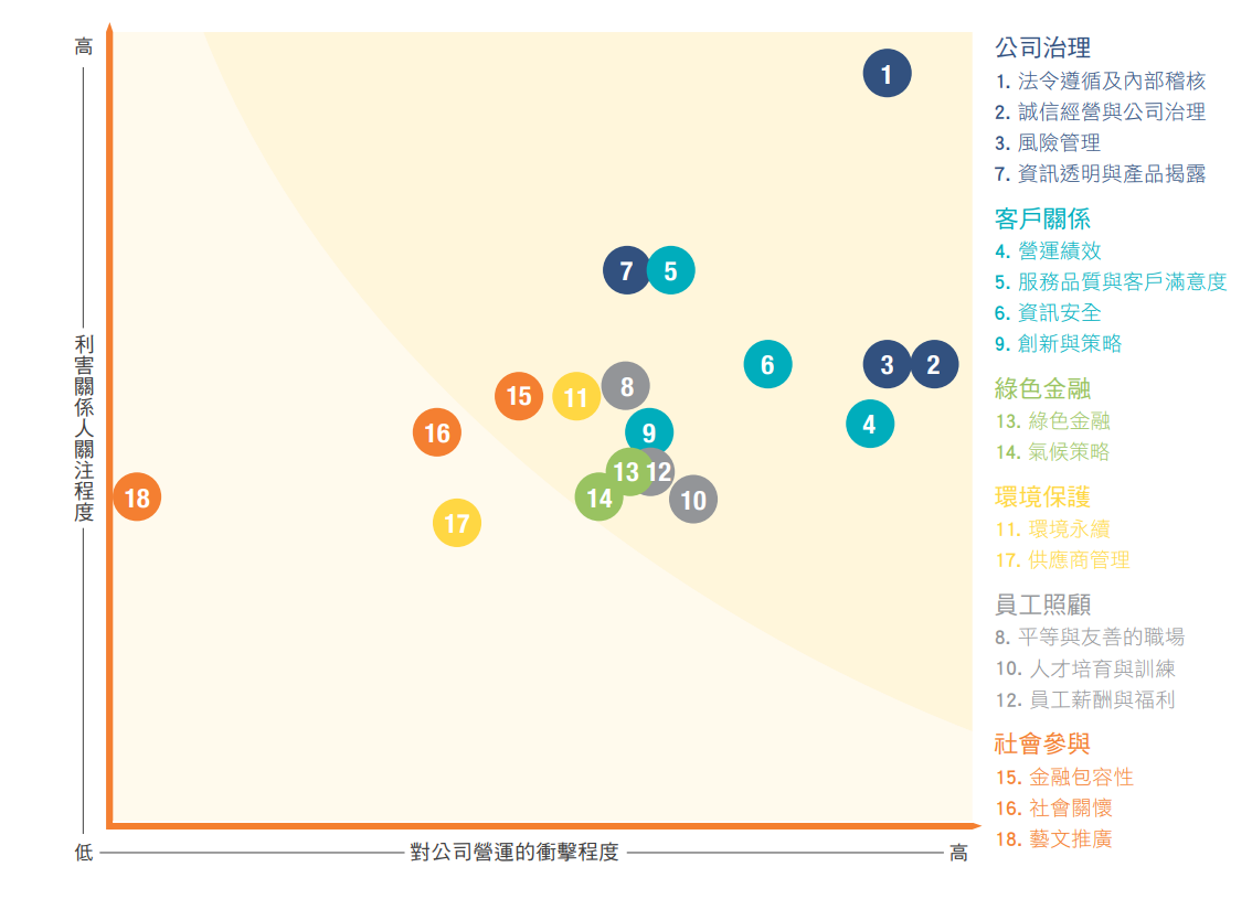 王道銀行透過多元化的溝通管道,同時考量國際永續發展趨勢以及國內外同業關注焦點,瞭解與歸納利害關係人的關注議題,2024年王道銀行永續重要議題共計18項,與前一年度相比無刪除或變動。為了解利害關係人對本行重要議題的關注程度,本行發送調查問卷予利害關係人,請其針對18項重要議題給予關注之評分,並由永續推展工作委員會成員填寫評估問卷,評估各個重要議題對「公司營運」的衝擊程度,依問卷調查結果進行分析,分析結果詳如下圖: