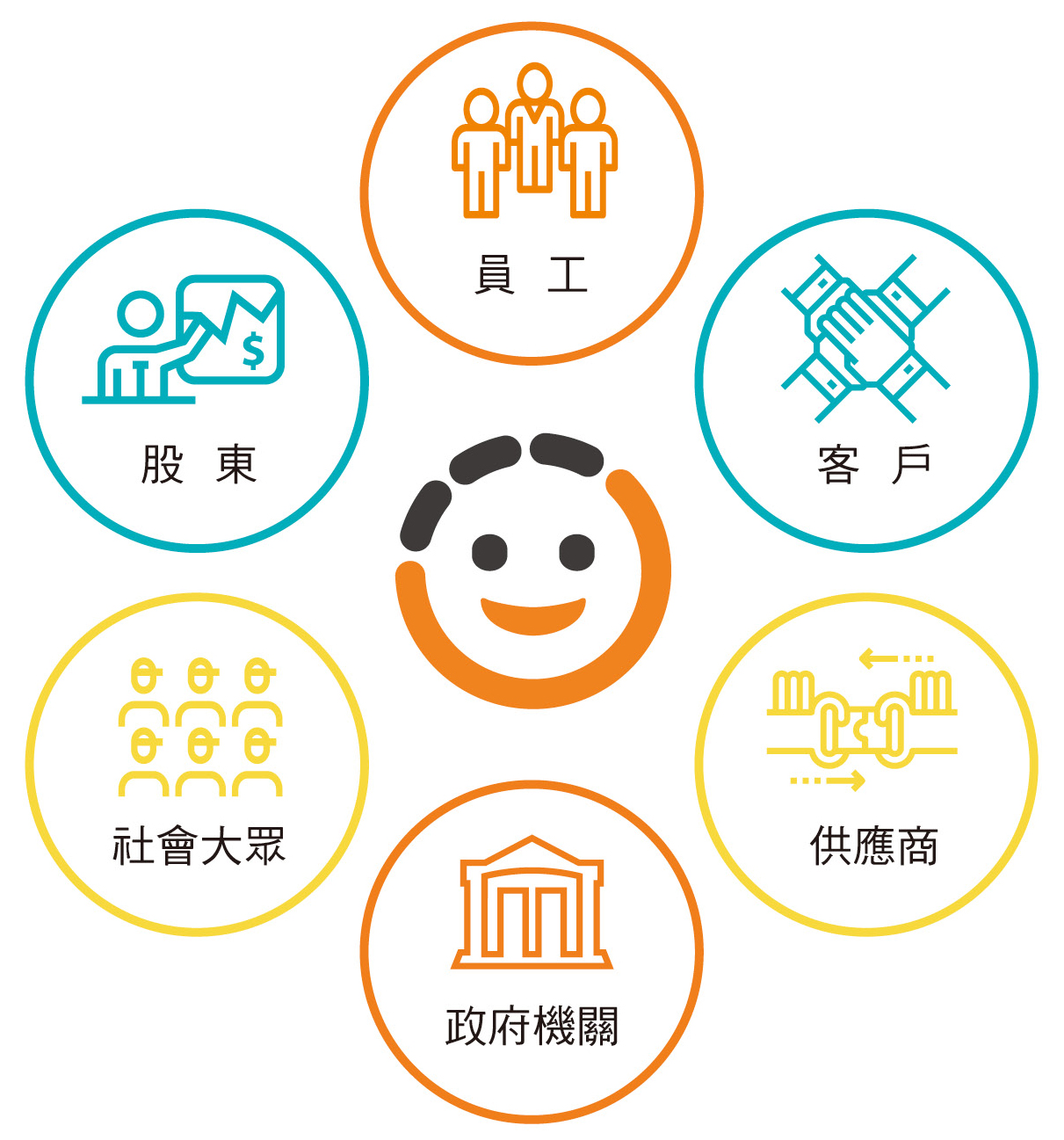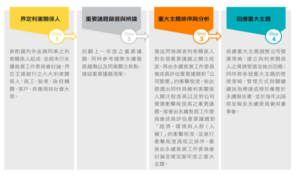 王道銀行營運範圍涉及多方面的利害關係人,主要有員工、客戶、股東、供應商、政府機關、社區、社會大眾以及媒體等,其所關心之議題多元且影響層面廣泛。為善盡企業社會責任,王道銀行透過多種管道與利害關係人進行雙向溝通,蒐集並辨識利害關係人所關注之重大主題,依此擬定管理方針。