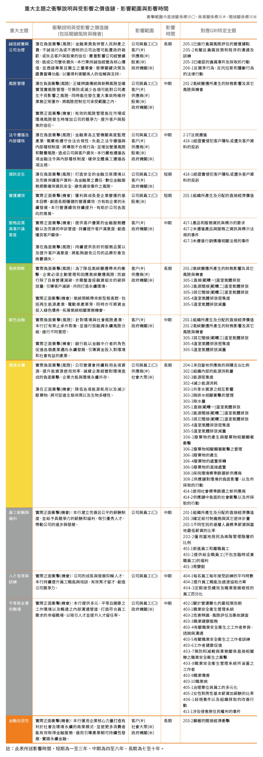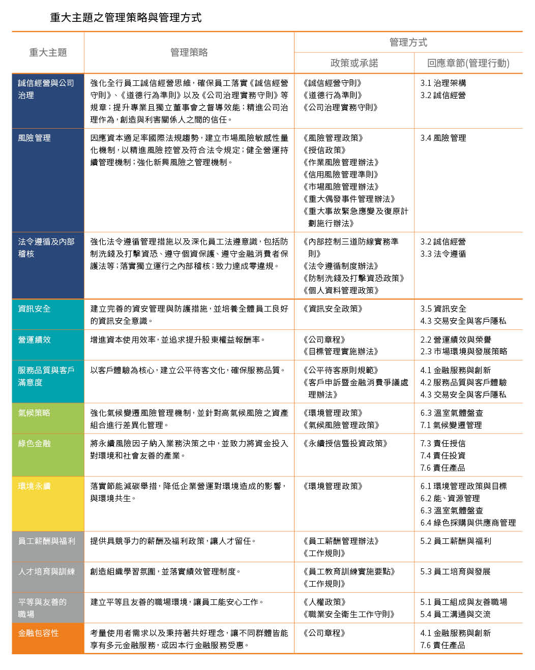 本行2024年重大主題之分析結果係考量了對內部營運和外部環境衝擊之雙重重大性原則,包括對公司營運的衝程度以及對經濟、環境與人群(人權)的衝擊程度,並經呈報永續推展工作委員會討論核准之後,再提報永續委員會與董事會核准,並揭露於本行2024年永續報告書。各重大主題之衝擊說明與受影響之價值鏈、影響範圍與影響時間,以及管理策略與管理方式詳如下: