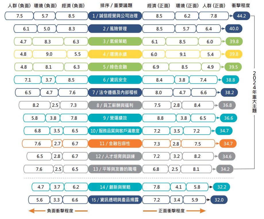 針對利害關係人關注程度高以及對公司營運衝擊程度高的重要議題,進一步由永續推展工作員會委員填寫評估問卷,評估該議題對「經濟、環境與人群(人權)」的正面和負面衝擊程度,分別給予正面衝擊和負面衝擊0 至10分之評分,衝擊程度愈高、分數愈高,衝擊程度愈低、分數愈低,當重要議題對「經濟、環境與人群(人權)」之正面和負面衝擊程度總分達34分(含)以上,則列為當年度「重大主題」。2024年度分析結果共13項重大主題詳如下圖: