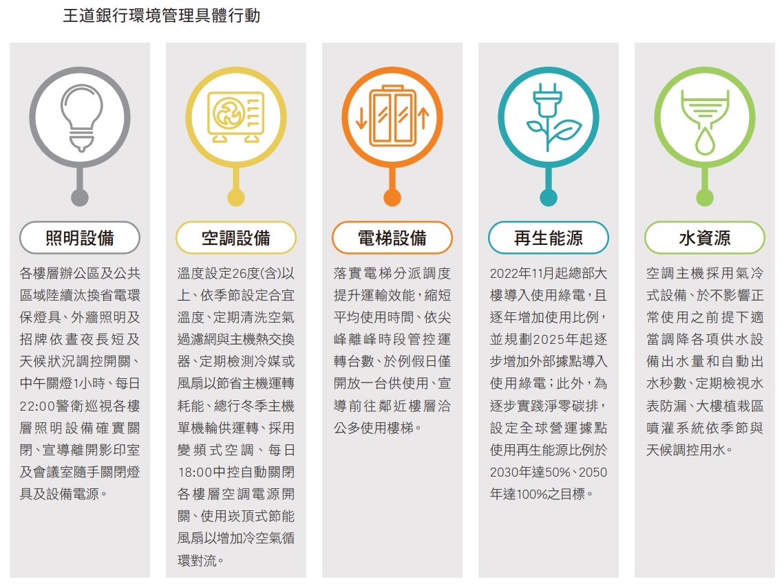 針對減緩氣候變遷以及邁向淨零碳排之議題,王道銀行積極推動各項低碳轉型計畫,除了持續降低日常營運的耗能量以及提升能源使用效率,我們也承諾本行全球營運據點再生能源使用量於2030年達50%、2050年達100%之目標,以達成2050年淨零碳排。此外,王道銀行身為中華民國工商協進會的成員,我們亦公開支持其「1.5度C氣候行動宣言」,承諾配合且支持本國「2050年淨零路徑」之規劃與目標,整合工商資源落實產業低碳轉型,以共同達成《巴黎協定》(Paris Agreement)全球升溫控制在攝氏1.5度內的願景。