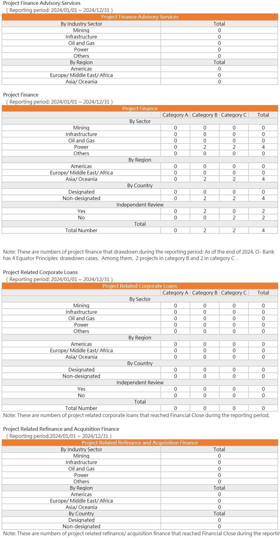 1.專案SR-嘉義,台灣 此為屋頂型漁電共生太陽能電廠之專案融資案件,養殖蝦子同時可以發電,推動漁村再造、帶動青年返鄉,促進地方產業的未來發展。本案風險等級為B級(中度風險),對環境與社會可能造成之負面衝擊有限、影響局限於特定地點,並且可透過減緩措施降低衝擊。 2.專案NFC-台南,台灣 此為屋頂型漁電共生太陽能電廠之專案融資案件,合計總裝置容量約120兆瓦(Megawatt,MW),此案委請挪威獨立第三方機構擔任環境及社會顧問,並出具赤道原則檢核評估報告。經查,本案已將環境管理、生物和文化資源保護、噪音控制、溫室氣體排放、土地開發等因子納入盡職調查,評估本案風險等級為B級(中度風險),對環境與社會可能造成之負面衝擊有限、影響局限於特定地點,並且可透過減緩措施降低衝擊。