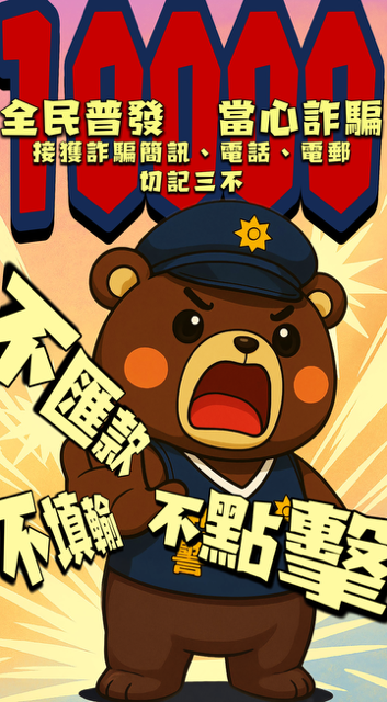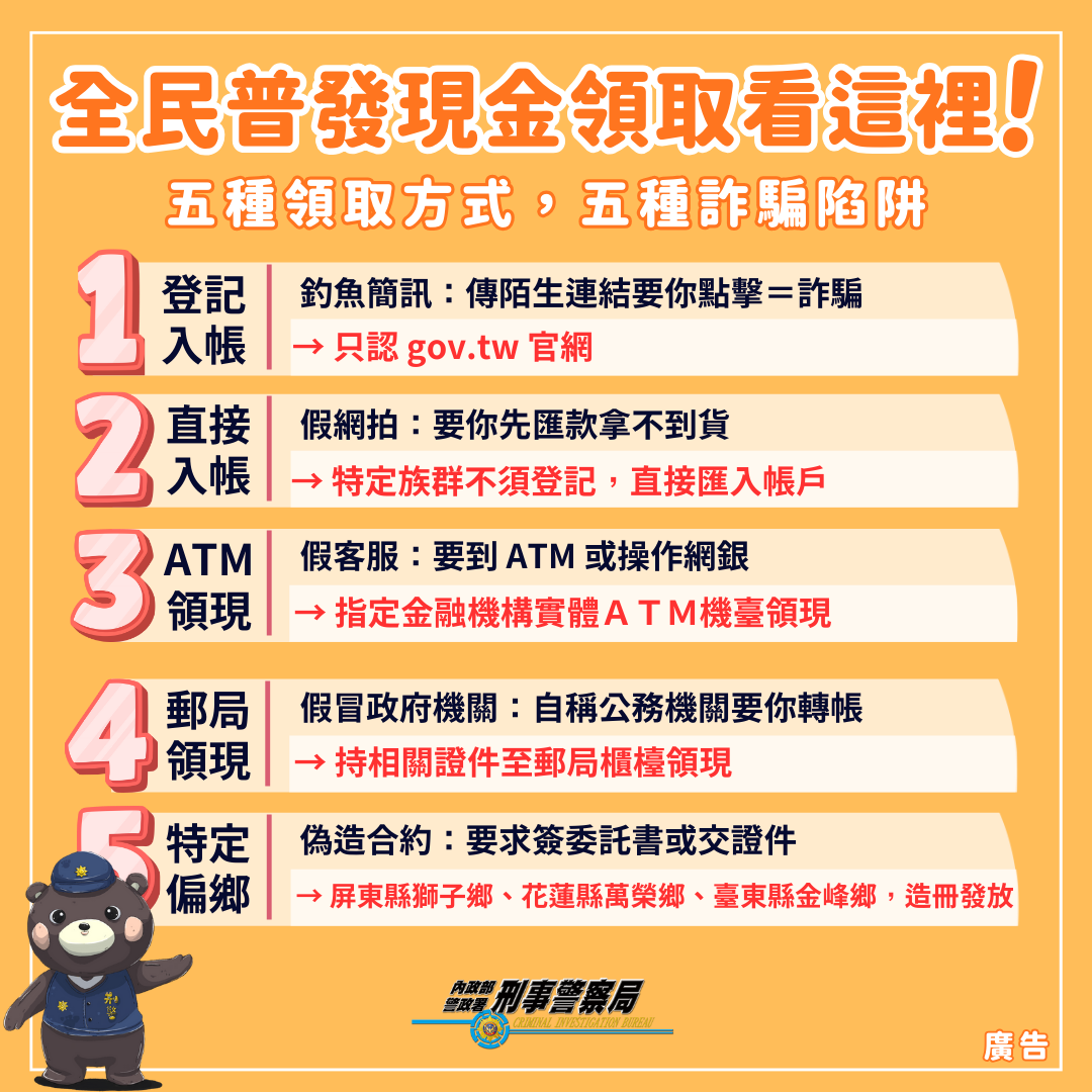 內政部警政署刑事警察局提醒:近期普發現金一萬為熱門話題,遭詐騙集團作為誘騙民眾受騙之話術,請民眾千萬別相信,提高警覺以守護自身財產安全。