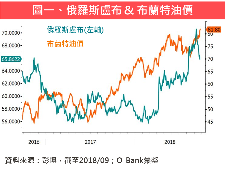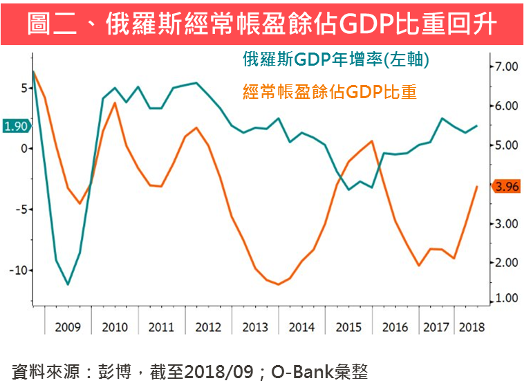 油價上漲不僅推升俄能源企業獲利,也推動GDP成長及改善經常帳盈餘,俄羅斯2Q18 GDP年增率1.9%,較首季1.3%回升,經常帳盈餘佔GDP比重也勁揚至3.96%,由於油價維持高檔,俄羅斯全年GDP成長率可望達1.8%,經常帳盈餘上升則有助於推升盧布走勢,俄羅斯盧布自9月10日的低點以來勁升7.2%,在今年以來十分弱勢的新興市場貨幣中領先升值,具有指標性意義,盧布升值可望帶動資金流入,推升俄股進一步走揚。
