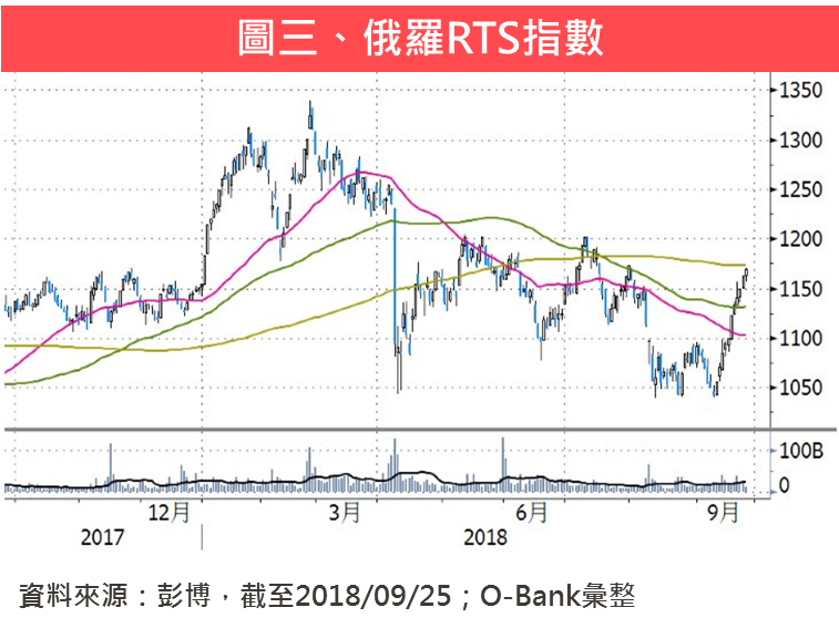 OPEC於9月24日召開會議,並未討論進一步增產的議題,在美國總統川普於推特發文砲轟油價過高,要求OPEC擴產壓低油價之際,OPEC完全無視美國擴產的要求,同時,非OPEC成員國最大產油國俄羅斯,也同樣表態將不會擴增原油產出,因此布蘭特油價一舉站上80美元。而俄羅斯能源股佔指數比重逾50%,且俄羅斯股市與油價相關係數達0.7,在油價大漲之下,俄羅斯股市也自低點快速反彈。OPEC成員國的減產協議將持續至2018年底,但由於美國對伊朗展開制裁,要求盟國停止自伊朗進口石油,且自11月起正式生效,在預期供給大幅縮減下,油價已有蠢蠢欲動之勢,再加上年底用油旺季將至,勢必推升油價預期,在OPEC與非OPEC成員國下次於11月10日召開會議之前, 應能維持油價較為強勢的走勢。