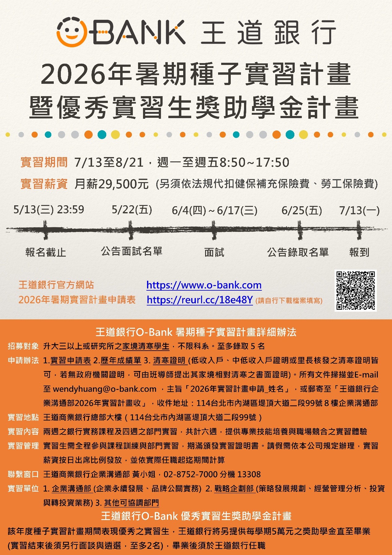 王道銀行2026年暑期種子實習計畫 熱烈招募中 2026/04/08 5/13(三)晚上23:59報名截止 錄取者可於王道銀行實習六周 實習期間月薪29,500元 --------------------------------------------------------------------------------------------------------- 實習期間:7/13(一)至8/21(五),週一至週五8:50~17:50 實習薪資:月薪29,500元 (另須依法規代扣健保補充保險費、勞工保險費) 招募對象:升大三以上或研究所之家境清寒學生,不限科系。至多錄取五名。 申請辦法: 1. 實習申請表 2. 歷年成績單 3. 清寒證明(若無政府機關證明,可由班導師提出其家境相對清寒之書面證明)郵寄至「王道銀行企業溝通部2025年實習計畫收」,地址同下。或E-mail至wendyhuang@o-bank.com,主旨寫明「申請2026實習計畫_姓名」,所有文件以掃描檔寄送。 實習地點:王道商業銀行總部,114台北市內湖區堤頂大道二段99號。(同收件地址) 實習規劃:兩週之銀行實務課程以及四週之部門實習共計六週,提供實習學生培養核心能力、發展專業技能並體現職場競合之實習體驗。 實習單位:1.企業溝通部(企業永續發展、品牌公關實務)2.戰略企劃部(策略發展規劃、經營管理分析)3.其他可協調部門 實習管理:實習生需全程參與課程訓練與部門實習,期滿頒發實習證明書。請假需依本公司規定辦理,實習薪資按日出席比例發放,並依實際任職起迄期間計算。 請至下列網站(https://reurl.cc/18e48Y)下載實習申請表 2026年5月13日(三) 晚上23:59截止收件(詳細時程請見DM) 聯繫窗口 王道商業銀行企業溝通部黃小姐,02-8752-7000 分機13308。