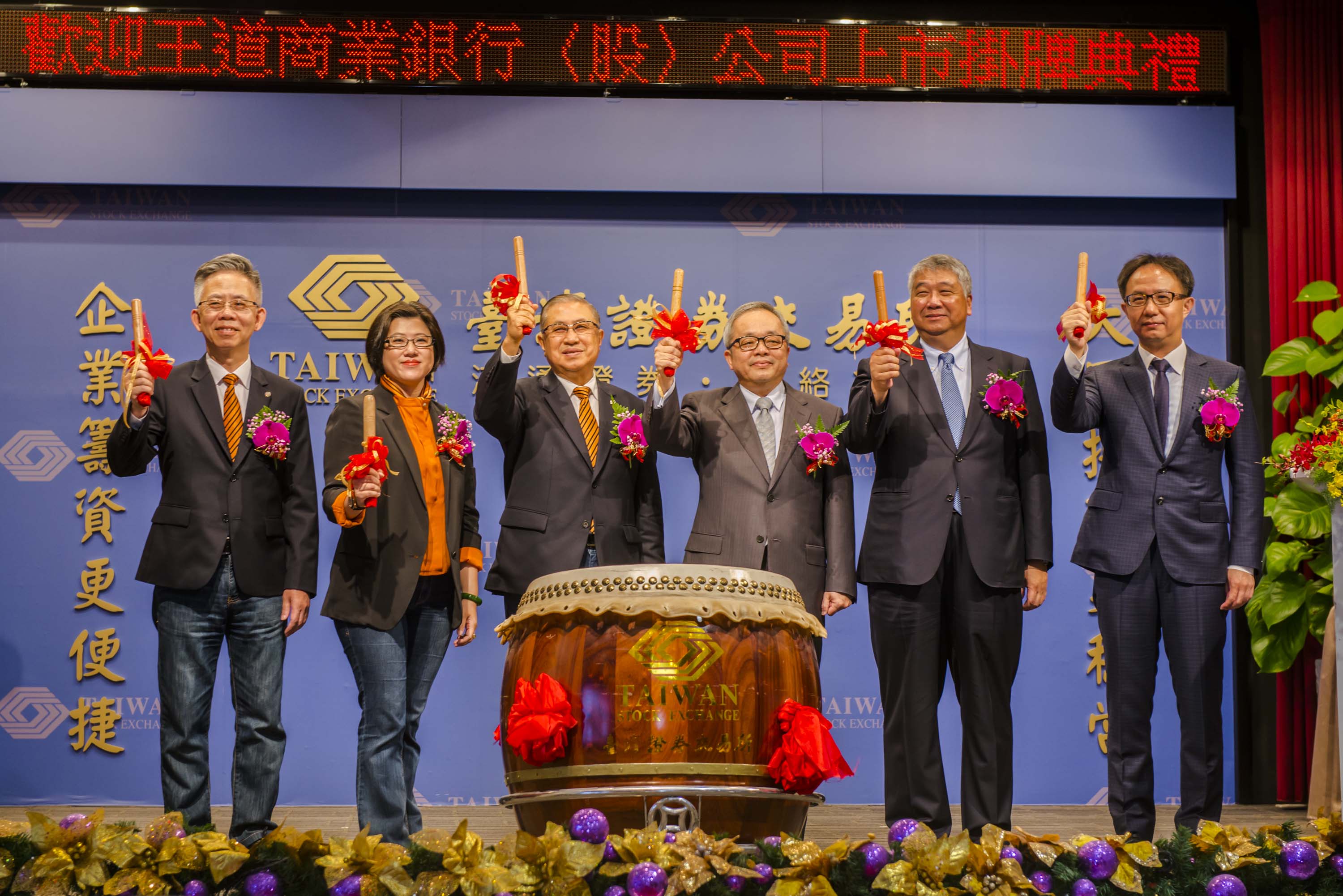 王道銀行(2897)今日正式於台灣證券交易所掛牌上市 2017/05/05 王道商業銀行(2897)今(5)日正式於台灣證券交易所掛牌上市,成為市場上睽違十多年來首家上市的銀行。今日掛牌典禮由王道銀行董事長駱錦明與副董事長駱怡君、總經理楊錦裕共同出席,並在證交所董事長施俊吉見證下,共擊開盤大鼓,在鼓聲中迎接上市並拉出長紅。 王道銀行此次辦理現金增資共新台幣225,000,000元,發行新股22,500張,其中保留2,500張員工認購,16,000張進行競拍,競拍結果最高得標價為9.3元、最低得標價為8.02元,加權平均價格為8.15元,遠高於底標價5.98元,且合格投標張數高達競拍張數的七倍,代表王道銀行的新股發行深受投資人的支持與青睞。其餘4,000張以每股七元進行公開申購,為底標價的1.17倍,總合格申購件數達173,166件,中籤率約為0.46%。 王道銀行長期以來績效表現穩健,2016年淨收益為新台幣43.2億元,近五年來淨收益複合成長率達16.35%;2016年稅前淨利則為新台幣18.6億元,若扣除因應轉型商銀的個金投資,稅前淨利達新台幣23.5億元,較前一年成長17%,成長率較全體國銀平均表現為佳;此外,為了與股東共享營運成果,王道銀行近三年的每股盈餘(EPS)與現金股利分別為:2016年度0.69元/0.45元(待股東會核可後通過)、2015年度0.72元/0.5元、2014年度0.74元/0.4元。 王道銀行的前身為台灣工業銀行,成立於1999年,過去精耕企業金融服務,與台灣產業共同成長,提供企業如企業金融、環貿金融、財務金融、投資業務、證券化及信託業務等多項服務,今年一月改制為王道商業銀行後,成為台灣首家以虛擬通路為主的原生數位銀行,藉由數位金融科技,致力打造普惠金融的願景,自今年初以來陸續推出全程線上信用貸款、一站式房貸APP、24小時空中視訊客服等創新服務,更開業界之先推出機器人理財,以大數據分析為消費者提供低門檻的專業投資建議。未來,個金業務將成為王道銀行另一重要成長引擎,與原本長期深耕的企金業務相輔相成,創造穩健成長的整體營運績效。 王道銀行董事長駱錦明表示:「很高興迎接這個歷史性的一刻,這是王道銀行邁向永續經營的重要里程碑。王道銀行過去多年來努力深耕,與台灣的企業共同成長,今年除了改制商銀並積極拓展個人金融業務之外,更成為上市公司,感謝主管機關的支持與投資大眾的肯定,我們將以更高的標準持續精進,開創永續發展的格局。」