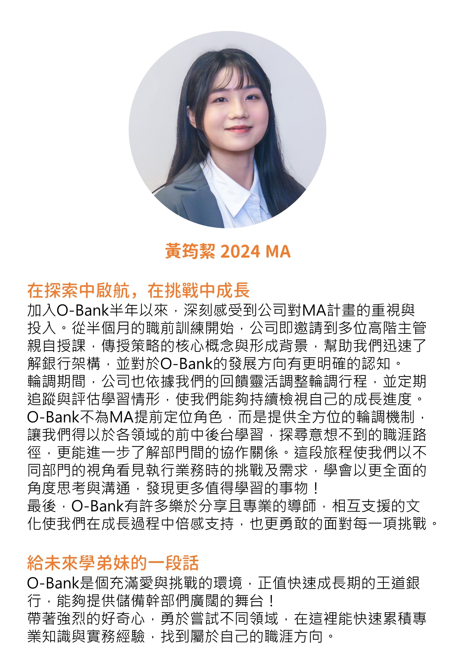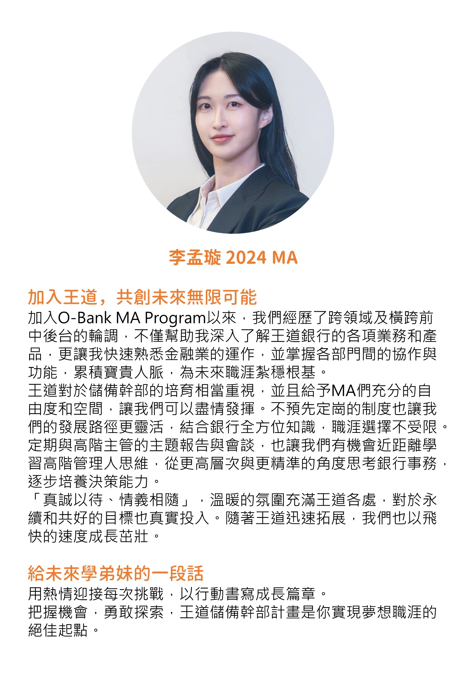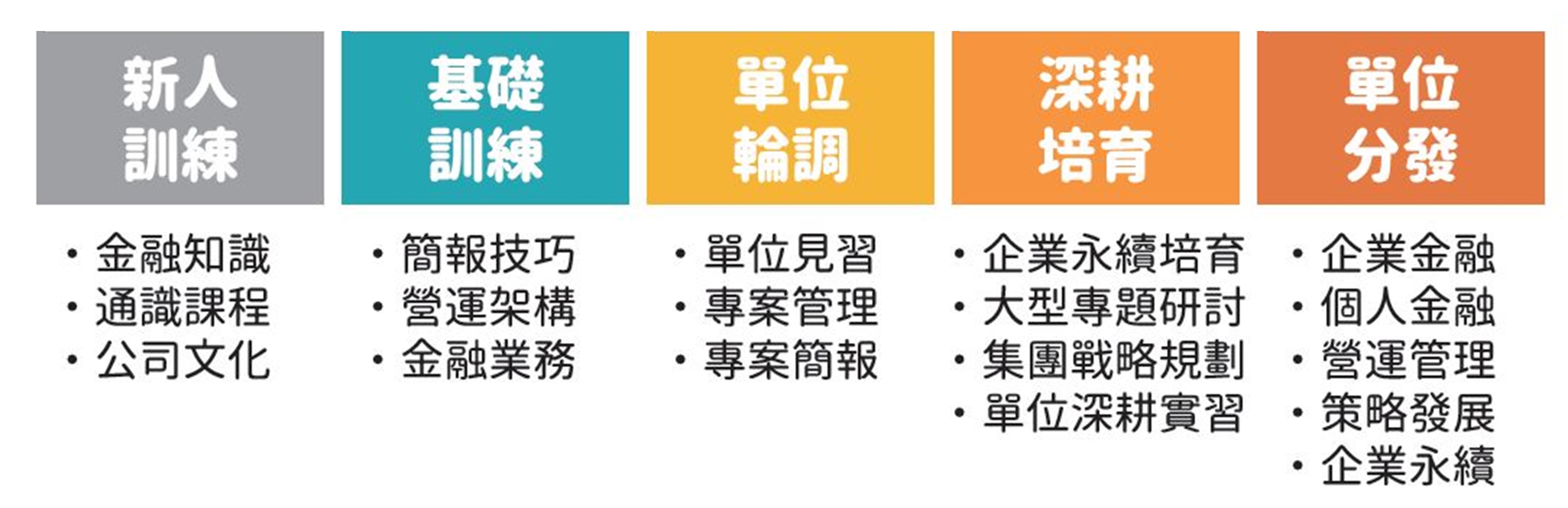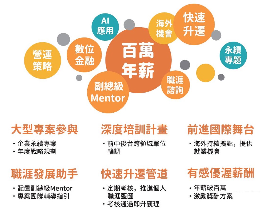 專案特色 我們提供企業金融、個人金融、營運管理、策略發展、企業永續之人才規劃,儲備菁英將歷經兩年培訓及輪調,依個人志願媒合分發適當職務,歡迎所有優秀人才加入! 我們知道清寒學子的不容易,所以更歡迎持低收 / 中低收 / 特殊境遇家庭證明的學子,與我們一起打拼!