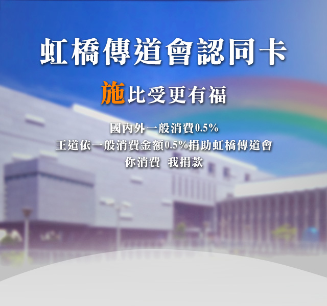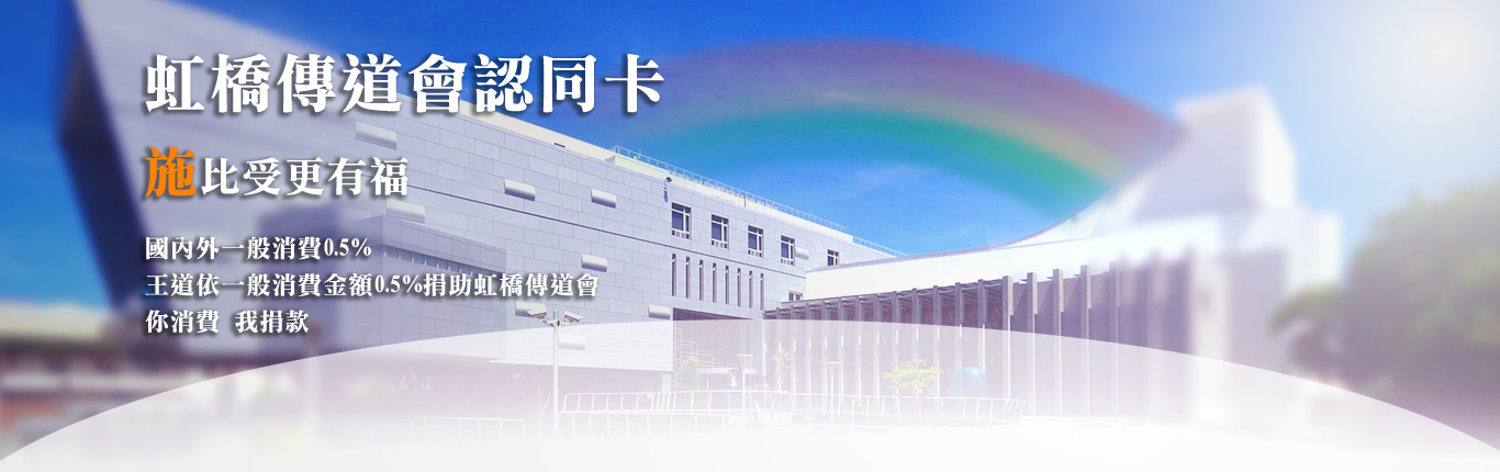 施比受更有福 2025年底前享現金回饋 國內外一般消費0.5% 王道依一般消費金額0.5%捐助虹橋傳道會 你消費,我捐款