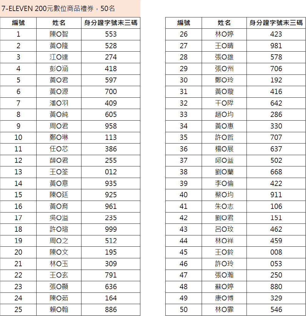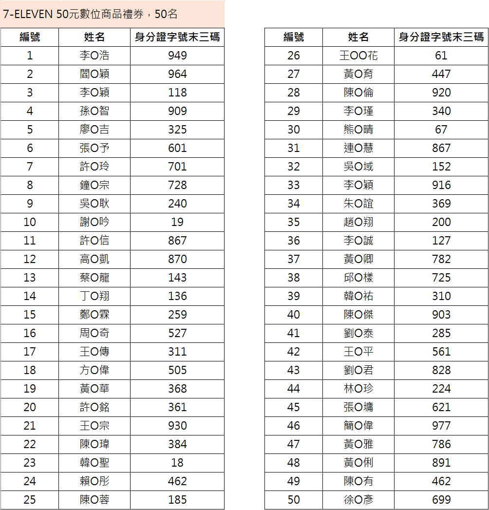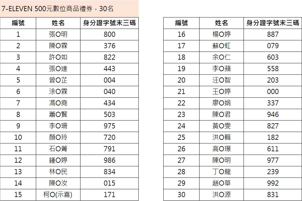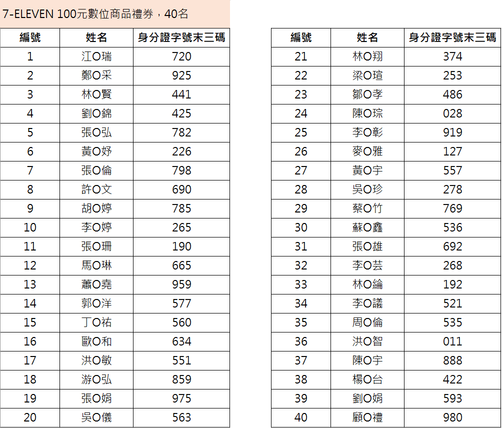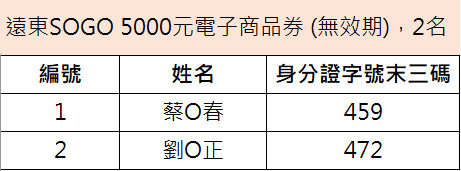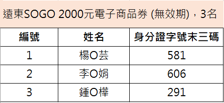 得獎名單: *中獎者如欲修改留存於本行之資料,請於4/24(五)之前聯繫本行客服人員,本行將以4/27(一)後之個資做為贈獎發放依據。 *如因中獎者留存於本行資料不正確,導致無法收取贈獎,本行將不負任何賠償責任或補發贈獎。