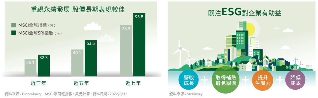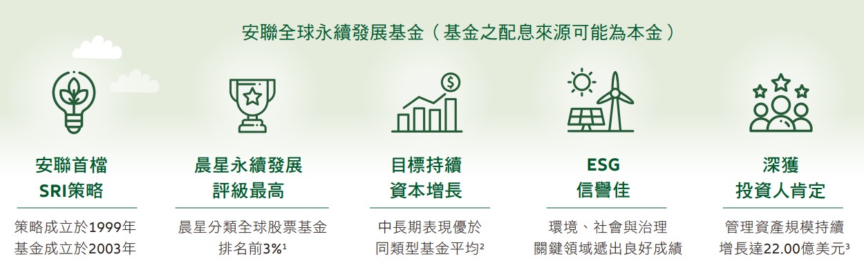【安聯投信】財富升級策略:以投資實踐永續,發揮綠色影響力 2022/12/15 永續不只是生活態度,更是資產配置中不可或缺的策略之一!放眼台灣資產管理業,身為「永續投資領跑者」的安聯投信,致力提供投資人最佳的永續投資洞見與解決方案,並倡議主動讓投資發揮影響力 ESG是環保思維,更是財富升級策略 根據晨星統計,僅管全球股票型基金在2022第2季轉為淨流出,全球永續概念基金規模與檔數也持續快速成長,累計上半年淨流入將近1200億美元, 不只是愈來愈多投資人加入行列,機構法人更是同步大力擁護,可說明ESG已不再局限於環保思維,更是下一步投資趨勢。 資料來源:晨星、聯合國WORLD INVESTMENT REPORT 2022 ,資料日期:2022年 重視ESG 企業更有競爭力,邁向永續 對企業具2大優勢 聽到「永續投資」,投資人可能不禁要問:對企業股價或自身的資產配置,有什麼優勢?具體而言,落實ESG,就是環境保護(E,Environmental)、社會責任(S,Social)以及公司治理(G,Governance)三大面向,可以幫助企業達成降低成本、提高營收兩大優勢。 以「降低成本」來說,隨著愈來愈多投資人希望將資金配在 ESG企業, ESG 表現佳的企業更容易取得資金,不僅是股票市場,更出現在貸款市場,以歐洲而言,已經出現企業簽署貸款協議時,利率會根據第三方機構所給予的 ESG 評級更動,換言之,如果該企業的 ESG 評級在隔年上升,貸款利率就會跟著調降,進一步降低企業的資金成本。 第二大優勢則是「提高營收」,當公司成長遭遇瓶頸,可以從 ESG 角度思考該如何突圍,舉環境保護(E)為例,有企業會透過建立污水管理系統、環境管理系統等設備,增加營運效率;而在社會責任(S)面,不少矽谷科技巨擘投入相當多的資源來留住好人才,平均生產力跟著提高,由此可知,企業愈認真投入ESG ,長期營運效率、營收目標就愈可期。 看見美麗世界 安聯投信永續系列基金陪伴投資人前行 永續的思維不僅讓企業升級,也讓投資人的資金可以發揮更大的影響力,安聯投信持續構建「安聯投信永續系列基金」,以境外基金來說,安聯全球永續發展基金(基金之配息來源可能為本金) 2022年一舉拿下SMART智富台灣基金獎全球股票型基金獎、海外ESG基金獎兩項大獎,這是如何辦到的?* 答案是:安聯全球永續發展基金(基金之配息來源可能為本金)在全球成長股中,積極尋找永續契機,該基金運用「多重把關機制」,選擇投資標的時,先排除營收以菸酒、色情、武器及賭博為主的企業,再運用SRI( Sustainable & Responsible Investment)產業最佳策略,為企業打分數,不只審視財務狀況,夠永續、能善盡企業社會責任CSR,才有機會進入股票池,唯有兼顧結構性成長、高品質、價值面的個股,才能獲得經理團隊的青睞。 *資料來源:SMART智富台灣基金獎,2022,為本基金A配息類股 (歐元)級別獲獎 資料來源:晨星、彭博、安聯環球投資,資料日期:2022/9。1 晨星ESG分數資料日期:2022/6/30,晨星永續評級由Morningstar與其旗下企業Sustainalytics基於投資組合本身進行評估,並與基金於 晨星之分類Global Equity Large Cap進行比較。2 基金績效日期:2022/9/30。同類型採用理柏環球股票類別,美元計價,基金近1、2、3、5年累積報酬率(級別為A歐元)為-23.66%、-4.36%、11.06%、 24.09%,同期間同類型基金平均為-25.49%、-6.76%、6.52%、12.91%。3 基金規模日期:2022/09/30。上述圖示僅供解釋說明使用,本文所載之任何意見,不構成任何投資建議或購買、出售及持有任 何特定證券 安聯精選主題基金 以投資實踐永續,發揮綠色影響力 安聯全球永續發展基金(基金之配息來源可能為本金) 安聯全球綠能趨勢基金 安聯證券投資信託股份有限公司 | 地址:104台北市中山北路2段42號8樓 【安聯投信獨立經營管理】本基金經金管會核准或同意生效,惟不表示絕無風 險。基金經理公司以往之經理績效不保證基金之最低投資收益;基金經理公司除盡善良管理人之注意義務外,不負責本基金之盈虧,亦不保證最低之收益,投資人申購前應詳閱基 金公開說明書。有關基金應負擔之費用(境外基金含分銷費用)已揭露於基金之公開說明書或投資人須知中,投資人可至公開資訊觀測站或境外基金資訊觀測站中查詢。安聯投信總 代理之盧森堡系列基金(AGIF)及其發行之境內基金,配息級別之配息可能由基金的收益或本金中支付(AMg2級別除外),或配息前未先扣除應負擔之相關費用(如AMg、BMg、 AMf、BMf級別)。任何涉及由本金支出的部分,可能導致原始投資金額減損。基金配息率不代表基金報酬率,且過去配息率不代表未來配息率;基金淨值可能因市場因素而上下波 動。本公司於公司網站揭露各配息型基金近12個月內由本金支付配息之相關資料供查詢,投資人於申購時應謹慎考量。有關境外基金配息金額之決定,係由境外基金機構根據已取 得之資本利得及股息收益狀況,並考量基金經理人對於未來市場看法,評估預定之目標配息金額。若本基金因市場因素造成資本利得及股息收益狀況不佳,將可能調降目標配息金額。 新興市場證券之波動性與風險程度可能較高,且其政治與經濟情勢穩定度通常低於已開發國家,可能影響本基金所投資地區之有價證券價格波動,而使資產價值受不同程度影 響。本基金為投資全球已開發國家之股票型基金,並將投資重點放在永續與責任投資策略,依「中華民國證券投資信託暨顧問商業同業公會之基金風險報酬等級分類標準」,本基 金聚焦
