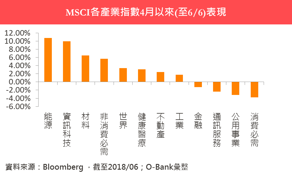 4月以來,MSCI世界能源指數如猛虎甦醒般,大漲10.80%,成為各產業中表現最為亮眼的類股,即使美元從4月中開始突破區間向上,震撼多個新興國家,油價卻持續在高檔震盪,影響甚小,面對近期市場焦點開始從「產油國的地緣政治風險」轉向「6/22的OPEC大會是否將放寬減產」,油價表現也從「漲勢強勁」轉向「高檔震盪」,令錯過這波能源類股的投資人紛紛開始詢問:「現在能源股還能追嗎?」,針對這問題,O-Bank有以下看法: