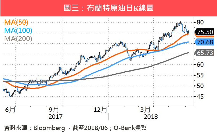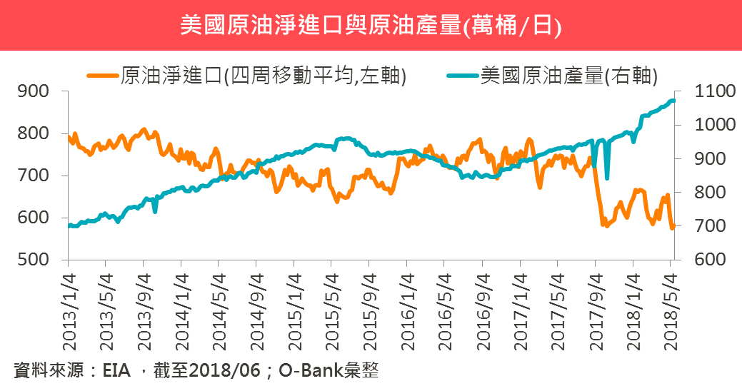 另一方面,根據EIA公布最新資料,目前美國原油淨進口為582萬桶/日,近半年以來數據皆處於600萬桶/日附近震盪,顯示美國原油需求力道仍然強勁,淨進口並未隨著原油產量持續擴增而下滑。從上述兩個論點探討,目前美國原油產量的提升對於布蘭特油價並無太大影響。