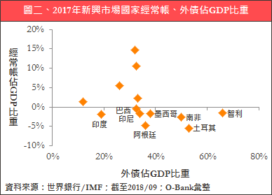 追根究柢,新興市場的巨震主要是受美元影響,因為隨美元升值、各國貨幣貶值,外債佔GDP比重較高國家的償債壓力將會提高,進而加大市場對於債務問題的擔憂,此時,若又同時出現經常帳赤字,則更容易被放大檢視,因為經常帳赤字通常代表一國經濟體質較脆弱,所以對於同時具備外債負擔高、經常帳赤字問題的國家說,一旦市場對該國投資信心不足,便很容易讓資金加速撤離,而近期匯率出現大幅貶值的國家幾乎都同時有此兩問題。