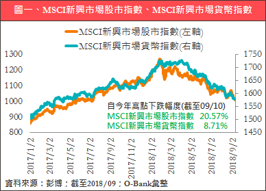 彭博資料顯示,截至9月10日,新興市場股市已從1月高點下跌20.57%,宣告步入所謂的「技術性熊市(指股市從最近高點下跌超過20%)」,甚至創下2008年金融海嘯以來最長連跌天數。而此時正值2008年金融海嘯10周年之際,卻出現這樣難堪的紀錄,影響了投資人對新興市場投資信心。除了股市外,新興市場貨幣也同樣糟糕,整體新興市場貨幣貶值了約8.71%。