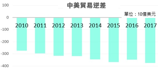 繼第一回合美國與中國互徵關稅500億美元後,第二回合的美中貿易戰又開打。9月17日美國總統川普宣布將對中國2,000億美元進口品加徵關稅後,促使中國於9月18日宣布將對美國600億美元商品加徵關稅,顯示美中之間的貿易衝突呈現螺旋式升高的壓力。 不過,中國反擊金額大幅縮減至600億美元,反映出中國可使用的籌碼相對為少。原因主要為當前中國出口至美國的金額顯著大於中國從美國進口的金額(5,056億美元 vs. 1,304億美元),也造成美中兩國的貿易逆差節節升高,去(2017)年更創下3,752億美元的紀錄新高(參見下圖)。