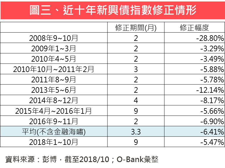觀察過去十年新興市場債券指數走勢,可以看出在經濟長期成長的趨勢下,新興市場債券指數呈現長期多頭走勢,統計漲勢中出現拉回走勢的期間及幅度,修正期間最短2個月,最長9個月,而修正幅度最低是2009年1月到3月的3.29%,最大則是2008年金融海嘯期間的28.8%,若扣除金融海嘯期間的極端值,平均修正幅度6.41%,今年以來新興市場債券指數修正5.47%,幅度已與平均值相去不遠,而修正時間9個月已經是近十年最長紀錄,修正可望進入尾聲。建議投資人可考慮利用指數的拉回尋找進場時機,佈局新興市場債券基金。