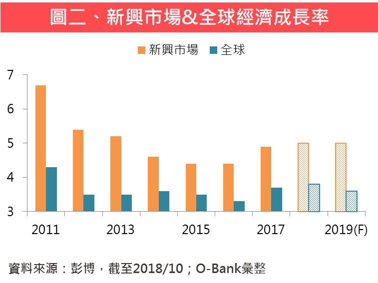 今年以來,聯準會升息縮表,再加上美元走強,新興市場貨幣貶值,造成部份新興國家債務風險上升,阿根廷、土耳其的債務危機浮上檯面,進一步衝擊新興債市的投資信心,今年以來新興市場債券指數走勢偏弱。自年初高點以來下跌5.47%,不過利空消息近期似乎稍有淡化,首先是阿根廷與IMF達成新協議,融資金額提高至571億美元,債務問題進一步舒緩;其次是土耳其重返國際債市,發行20億美元政府債並獲得超額認購;顯示投資人信心回復,阿根廷、土耳其的信用交換違約(CDS)亦較9月明顯下降,在大舉拋售潮過後,金融市場對利空衝擊的抵抗力也將增強。