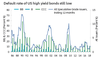 一般而言,投資債券除需留意利率風險外,也需注意違約風險。美國政府公債因為有美國政府擔保,市場通常視為無風險投資標的;但新興市場政府債則有違約風險存在。至於公司債方面,企業發行公司債券以後,若營運不善,到期無法履行契約也會產生違約風險。因此,一個國家的整體經濟是否持續繁榮,有利企業營運獲利與降低違約率,也是影響公司債市場走勢的重要因素。 在美高收益債方面,因為當前美國經濟持續穩健增長,企業獲利表現優於預期,美國高收益債表現持穩,且有助於違約率維持低檔(參見下圖)。目前市場預期2018年美國高收益債券違約率大約為2.5%,2019年違約率有望進一步減緩至2%,顯示美高收益債的基本面相對穩健。