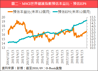 從基本面來看,雖然MSCI世界健護指數有3成比重是放在藥廠,是權重最大的產業,但根據彭博的預估,在美國經濟環境仍相對健全下,預估EPS仍持續上修,且在稅改影響下,預料今年EPS成長率可望高達30%,而明年即使有高基期因素影響,EPS仍有8.5%成長潛力。此外,目前本益比僅約17倍,並不算高,健護產業仍有很高的投資價值,建議可逢低布局。