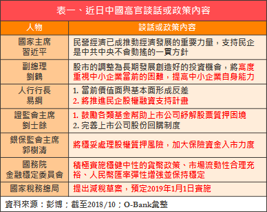 面對陸股低迷的表現,中國政府高層在10/19齊聲信心喊話,一行兩會(央行、銀保監會、證監會)主席、副總理劉鶴輪番現身,甚至,國家主席習近平也罕見地出面表態將持續維穩經濟,試圖安撫市場不安情緒,而滬深300指數也很給面子的在短短兩個交易日大漲超過7%做回應。目前看來,中國政府以政策托底股市的意圖更加明確,預料將有助重振市場信心。