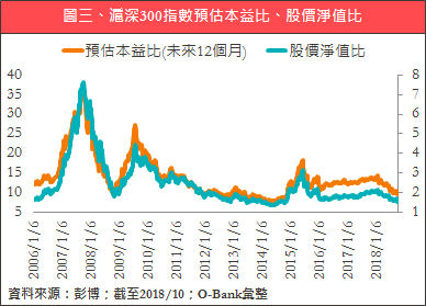 再從價值面角度切入觀察,可發現滬深300指數的預估本益比和股價淨值比都已降至近10年來低位,約分別降至9.99和1.59倍。而由於金融股經常是拉低陸股評價面指標的原因,若剔除金融股後,目前A股整體股價淨值比為1.85倍,同樣降至近10年來低位,顯示中國股市可能再下跌的空間相對有限。