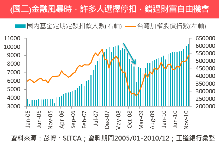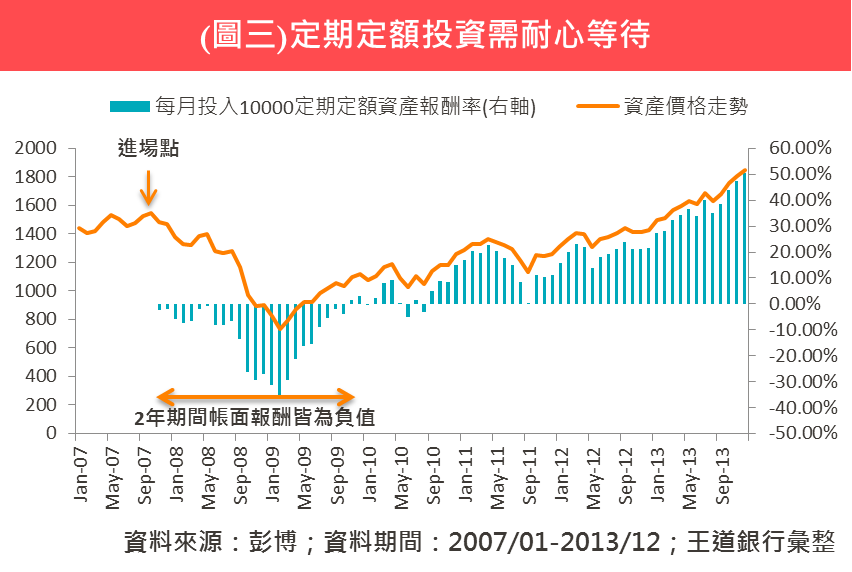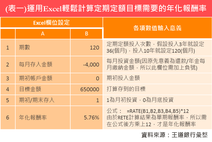 【定期定額】我是否適合定期定額投資? 2020/04/10 很多投資達人會鼓勵投資人以定期定額方式投資,但您是否想過,自己是否適合?本文藉由定期定額投資的特性,找出適合定期定額的族群,另外也分析為什麼要耐心持續扣款,才有機會提高成功機率。建議初次投資或是想了解自己是適合定期定額還是整筆(單筆)的投資人,可以藉由本文判斷自己是否適合定期定額投資,本文最後,提供簡單Excel,輕鬆算出定期定額目標所需年化報酬率。 1. 願意每月省下3,000元,換取未來一台車的社會新鮮人/小資族 根據主計總處資料,2018年30歲以下台灣人平均年所得為47.28萬元(平均月所得為39,400元),若您在台北市就業,對照每人每月花費平均為28,550元,相減之後僅剩10,900元,若再扣除孝親費或是其他娛樂費用,每月能存下的費用可能所剩無幾。假設運用定期定額進行基金投資,每月最低門檻僅需要3,000元,只要預先設定好扣款標的與扣款金額,每月日期一到系統便會自動執行扣款動作,假使當月需要額外花費無法投資,還能在扣款日前進入設定暫停扣款,對於剛踏入社會,閒錢不多的年輕人或是小資族,定期定額可以說是初次參與踏入投資領域最適合的方式! 2. 金融市場理解不多,也沒有空鑽研,又想讓財富增值的你 股債匯市環環相扣,運作機制極其複雜,不同國家的金融市場也彼此牽連,沒有背景或是花點時間研究,可能難以參透其中的奧妙,即使是全球最大的避險基金─橋水,在面臨3月份的金融急挫,也難逃一劫面臨投資部位縮水20%的窘境,更何況是對於金融市場運作全貌認知甚少的多數大眾。 另一方面,雖然在工作幾年後薪水可能提高,相較於社會新鮮人,每月可投資的金額較高,但台灣多數人工時長,下班後還要陪伴家人、照顧小孩,算一算難以有自我的閒暇時間,即使想要學投資,看到書店牆面上琳琅滿目的相關書籍可能也會立馬澆熄興致,最後只能選擇靠薪水收入過活,難以從其他管道得到財富自由機會。而定期定額對於金融市場運作的理解並不需要過於深入,更需要的是耐得住性子與在市場波動劇烈時能夠持續不停扣的決心 (以圖二為例,在2008年金融海嘯時,許多定期定額的投資人無法忍受負面消息,選擇停扣,錯過財富自由機會)。 3. 定期定額適合穩穩追求獲利,不積極追高殺低的長期投資 假設我們把美股S&P 500當作是一檔基金,即使在2007年高點時進場,每月定期定額投資10,000元,在熊市衝擊下,整個投資部位會先承受連續24個月帳面報酬率皆為負值的困境,其後隨著美股牛市再起,帳面虧損就漸漸由負翻正。從上述例子來看,定期定額一次進場至出場通常3-5年的中長期投資,如果您是習慣操作股票、期貨、選擇權、外匯或是過於習慣基金單筆進出的的投資人,對於金融資產進出頻率較快,可能無法忍受定期定額的投資長度,加上一旦面臨空頭走勢時,容易受外部消息壓力或是過去操作習慣進而停損,反而容易功虧一簣,因此這一類人可能較不適合定期定額,但若就資產配置及分散風險的角度,操作較積極的投資人,其實仍可以善用定期定額平均攤平的好處分散投資風險。 利用Excel輕鬆計算,訂定定期定額投資目標 假設要在10年內以每月定期定額4,000元的方式,希望存到65萬購車,根據計算需要找到平均每年報酬率5.76%的投資商品,若計算過去10年各項資產的平均年化報酬,美股、全球股、台股皆可達到5.76%的水準。目前正處於社會新鮮人的您,2008年您可能還只是個學生而錯過了財富重分配時機,但面臨近幾週的重挫,此時疫情的不確定性,或許是投入定期定額的最好時機。如果上述定期定額並非您的投資目標的話,該如何計算年化報酬率?其實只要運用Excel的函數─RATE就可以輕鬆計算(見表一說明)。 王道精選基金 摩根士丹利環球機會基金A 立即申購 安聯收益成長基金-AT累積類股(美元)(本基金有相當比重投資於非投資等級之高風險債券) 立即申購 復華數位經濟基金 立即申購 注意事項 王道商業銀行投資顧問服務係無償提供,投資建議乃由王道商業銀行投資顧問分析人員根據各項市場資訊加以整理彙集及研究分析,內容僅供參考,如有涉及有價證券或金融商品相關記載或說明,並不構成要約、招攬、宣傳等任何形式之表示。投資人知悉且同意其所作成之任何交易均不得視為係王道商業銀行為其作成之投資決定,且須由投資人自己承擔投資相關風險。 王道商業銀行並未且不得代理投資人為任何決定、處理投資事務或從事證券投資行為,且王道商業銀行並未亦不得與投資人為證券投資收益共用、損失分擔之約定,投資人應基於獨立判斷自行決定是否依投資建議進行交易,投資人如參考或接受投資顧問服務之投資建議進行相關交易時,應自行承擔所有投資風險(包括但不限於投資金之損失、價格波動、匯率變動及政治等風險等),王道商業銀行並不保證投資人之獲利或負擔損失。 基金之交易特性與存款、股票及其他投資工具不同,投資人於開戶及決定交易前,應審慎評估本身之財務狀況與風險承受能力是否適合此種交易,並充分瞭解下列事項: (1)基金買賣係以投資人自己之判斷為之,投資人應瞭解並承擔交易可能產生之損益,且最大可能損失達原始投資金額。 (2)投資建議之基金均經金融監督管理委員會核准或同意生效,惟不表示絕無風險。基金經理公司以往之經理績效不保證基金之最低投資收益;王道商業