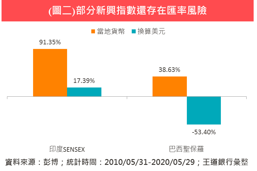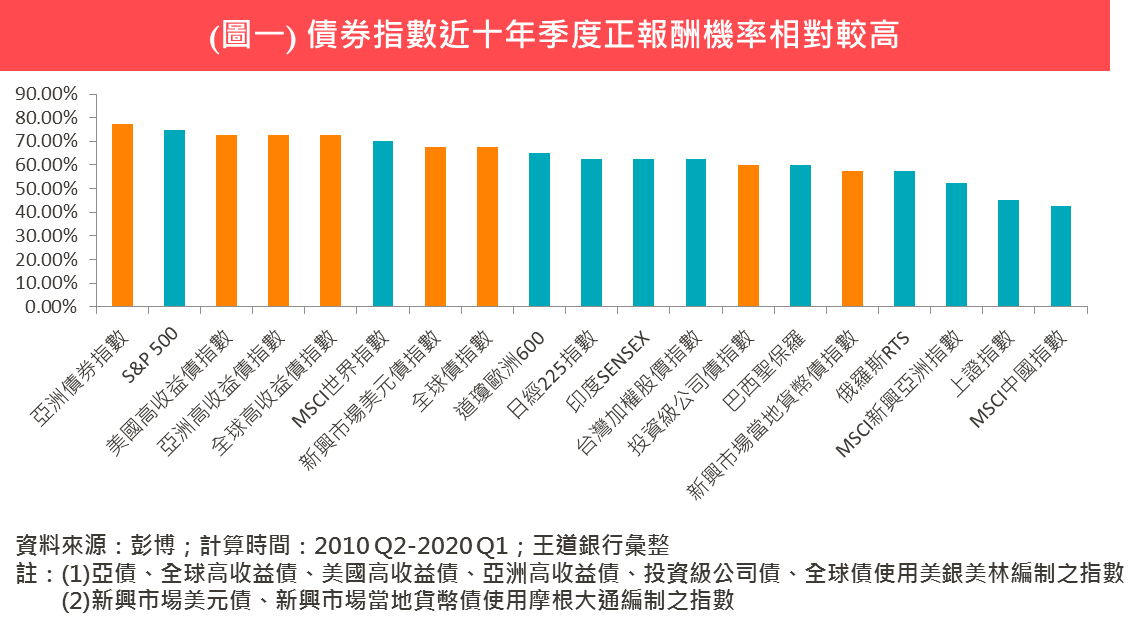【債券基金】投資債券基金的報酬真的比股票基金差嗎? 2020/06/16 「相對股票基金,投資債券基金報酬相對差?」對於這個問題,許多人皆會將問句改為肯定句,因為相對於股票基金,債券基金波動相對小,較難達成高報酬,因此投資債券基金的投資人,多數是以領取配息創造每月現金流作為主要訴求。但債券基金在報酬上與股票基金相比是否真的屈居劣勢? 本篇以三個面向比較常見的股票及債券指數,發現債券長期投資的表現優於股票,打破很多投資人的印象,原因為何?請見本篇接下來的分析。 近十年季度正報酬機率,債券表現優異 若將常見基金所追蹤的19種債券/股票指數進行季度正報酬機率比較,過去十年(從2010年第一季計算至2020年第一季),債券指數除了投資級公司債、新興市場當地貨幣債指數外,其他債券指數季度正報酬機率皆在67.5%之上,位居比較指數的前段班(見圖一橘色柱狀體)。因此,債券除了具有抗跌的能力外,其季度正報酬的表現也是比股票優異,因此,對於投資一遭遇市況不佳,便會時時刻刻掛心的投資人,建議可選擇債券基金作為布局,提高投資正報酬機率。 債券風險報酬率高,能以較小波動換取較大報酬 一般投資人對於風險與報酬的認知處在風險越大的產品,較容易獲得越高的報酬,因此相較於債券,股票能帶來更高的報酬,其實不然。沿用圖一所整理的19種債券/股票指數,計算其近十年的年化報酬率、年化標準差與每單位風險報酬可以發現兩項結果:(1)近十年的總報酬來看,最佳的前三名為股票指數,但績效倒數兩名也是股票指數。(2)利用每單位風險報酬率來衡量相同風險下投資人所能獲得的報酬,可以發現除了當地貨幣債之外,其餘7種債券指數皆位居前茅,顯示投資債券不僅能降低資產波動外,風險報酬率更能展現出持有這些債券連結的基金標的CP值相對股票優異。 投資新興市場股票承受更多匯率風險 若探討投資新興市場需面臨的匯率風險,投資新興市場股票會比新興市場債券承受相對較大匯率風險,主要原因在於新興市場債券基金有以美元計價發行的債券做為選擇,而投資新興市場股票基金,經理人須兌換成當地貨幣後,才能進入投資。以印度、巴西股市為例(見圖二),若暫不考慮匯率風險,過去十年來,印度SENSEX指數與巴西聖保羅指數分別上漲了91.35%與38.63%,但若考慮匯率風險,兩指數折算成美元計價,則同期間報酬率則縮減為17.39%及-53.40%。由於許多的新興市場股票基金都以美元或新台幣計價,因此投資人觀察指數走勢與基金淨值,有時都會發現較大落差,其實多數時間都可能不是經理人操作績效上的問題,而是新興市場貨幣匯率貶值所致,假若選擇新興市場美元債基金參與投資新興市場的高成長,便可避開匯率風險。 從上述觀點可以得知,我們或可打破傳統迷思,並非僅有配息需求的投資人才應該選擇債券基金,從指數季度正報酬、風險報酬率來看,投資債券基金的報酬並沒有想像中的差,另一方面,除了新興市場當地貨幣債基金外,其餘列舉債種也均以美元計價,減少了投資上所可能承受的匯率風險。 王道精選基金 富達基金-亞洲高收益基金(F1穩定月配息-美元)(本基金主要係投資於非投資等級之高風險債券且配息來源可能為本金) 立即申購 鋒裕匯理基金新興市場債券A美元(穩定月配息)(本基金主要係投資於非投資等級之高風險債券且配息來源可能為本金) 立即申購 注意事項 王道商業銀行投資顧問服務係無償提供,投資建議乃由王道商業銀行投資顧問分析人員根據各項市場資訊加以整理彙集及研究分析,內容僅供參考,如有涉及有價證券或金融商品相關記載或說明,並不構成要約、招攬、宣傳等任何形式之表示。投資人知悉且同意其所作成之任何交易均不得視為係王道商業銀行為其作成之投資決定,且須由投資人自己承擔投資相關風險。 王道商業銀行並未且不得代理投資人為任何決定、處理投資事務或從事證券投資行為,且王道商業銀行並未亦不得與投資人為證券投資收益共用、損失分擔之約定,投資人應基於獨立判斷自行決定是否依投資建議進行交易,投資人如參考或接受投資顧問服務之投資建議進行相關交易時,應自行承擔所有投資風險(包括但不限於投資金之損失、價格波動、匯率變動及政治等風險等),王道商業銀行並不保證投資人之獲利或負擔損失。 基金之交易特性與存款、股票及其他投資工具不同,投資人於開戶及決定交易前,應審慎評估本身之財務狀況與風險承受能力是否適合此種交易,並充分瞭解下列事項: (1)基金買賣係以投資人自己之判斷為之,投資人應瞭解並承擔交易可能產生之損益,且最大可能損失達原始投資金額。 (2)投資建議之基金均經金融監督管理委員會核准或同意生效,惟不表示絕無風險。基金經理公司以往之經理績效不保證基金之最低投資收益;王道商業銀行/基金經理公司除盡善良管理人之注意義務外,不負責該基金之盈虧,亦不保證最低之收益。本文提及之經濟走勢預測不必然代表基金之績效,本基金投資風險請詳閱基金公開說明書,投資人申購前應詳閱其公開說明書及投資人須知,投資人於申購前應審慎詳閱各該金融商品說明檔,並衡量自身之風險承擔能力。 (3)由於高收益債券之信用評等未達投資等級或未經信用評等,且對利率變動的敏感度甚高,故本基金可能會因利率上升、市場流動性下降,或債券發